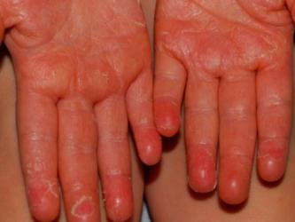Las lesiones acrales observadas en niños durante la pandemia de SARS-CoV-2 principalmente son de tipo perniosis o lesiones similares a eritema multiforme, sin embargo también se han observado lesiones con eritema y edema palmoplantar con posterior descamación de patrón centrífugo descritas como