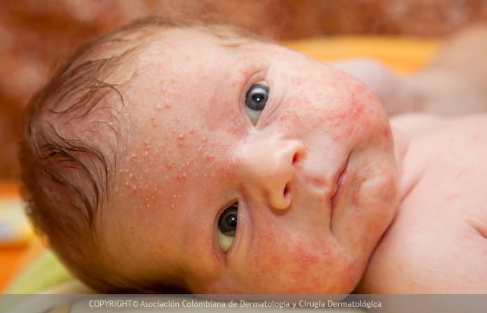 El acné neonatal es una variante del acné vulgar que se produce por los cambios hormonales que sufren la mamá y el bebé durante el embarazo. Se presenta hasta en el 20% de los recién nacidos sanos, las lesiones aparecen alrededor de la segunda semana de vida y mejoran espontáneamente antes de los 3 meses de edad.