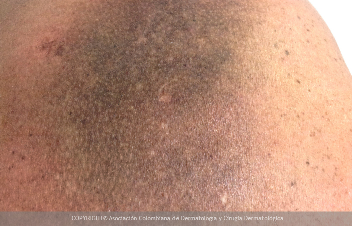 La amiloidosis es una enfermedad en que se depositan diferentes proteínas denominadas amiloide en los tejidos del cuerpo, y cuando esta enfermedad compromete la piel se denomina amiloidosis cutánea. La llamada amiloidosis macular es una forma de amiloidosis cutánea que hace referencia al depósito de estas proteínas en la piel produciendo unas lesiones que se observan como manchas color marrón oscuro y que provocan rascado. Las lesiones se localizan predominantemente en la espalda alta aunque pueden comprometer toda la espalda y el pecho así como extremidades y glúteos. El diagnóstico debe ser hecho por un dermatólogo quien iniciará tratamiento e informará que se trata de una enfermedad que afecta únicamente la piel y que no se encuentra asociada a depósito de amiloide en otros órganos.