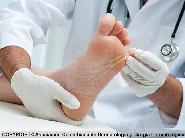 La forma más frecuente de presentarse es la aparición de una descamación macerante entre el 4º y 5º espacio interdigital, acompañado de rasquiña y con tendencia a extenderse hacia las plantas y lados de los pies.