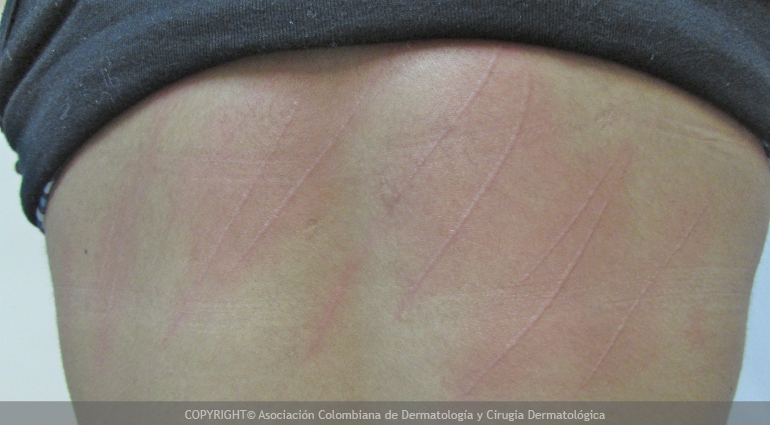 En el dermografismo la roncha es lineal y aparece en el sitio en donde se estimula enérgicamente la piel con un objeto firme.