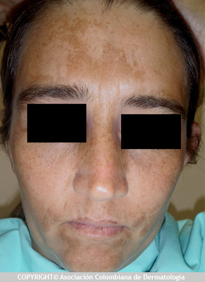 Se ven con unas manchas pardas clara o a veces más oscuras que comprometen en centro de la frente, las mejillas y el labio superior, pero si va aumentando, puede comprometer toda la cara.