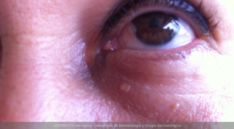 Se sitúan en la cara, preferentemente alrededor de párpados inferiores, pudiendo presentarse en otras partes del cuerpo como el cuello, tronco o genitales. Estas lesiones no causan muchos síntomas.