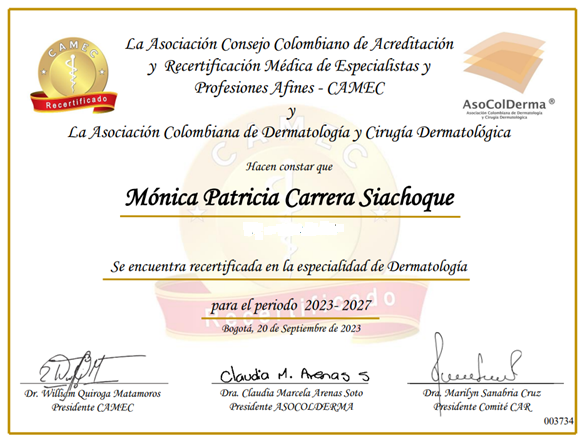 “La recertificación médica es un proceso riguroso que refleja su continua búsqueda de la excelencia en la atención médica y su compromiso con la mejora constante en el campo de la dermatología. Su éxito en este proceso es un testimonio de su experiencia y competencia en la disciplina, y estamos orgullosos de contar con profesionales de su calibre en nuestra comunidad”