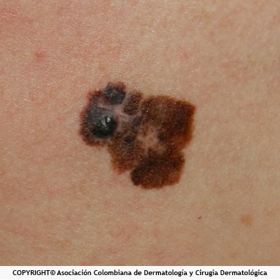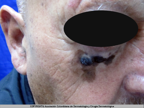1. Melanoma del lentigo maligno: es una mancha pigmentada de varios tonos, café-pardo o marrón, con puntos negros, bordes irregulares, localizada en cara o cuello. Esta lesión permanece así por mucho tiempo pero luego crece de forma elevada y cambia de color a negro.