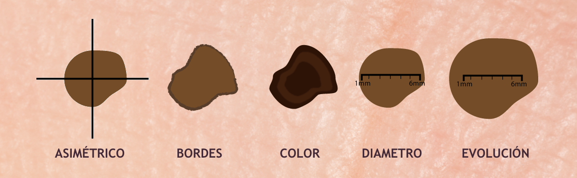 Para esto se utiliza el A, B, C, D, E del melanoma, que permite evaluar las características de los lunares o de las lesiones pigmentadas nuevas que aparecen en la piel. Si se presenta alguno de estos hallazgos, debe consultar al dermatólogo para que revise la lesión.