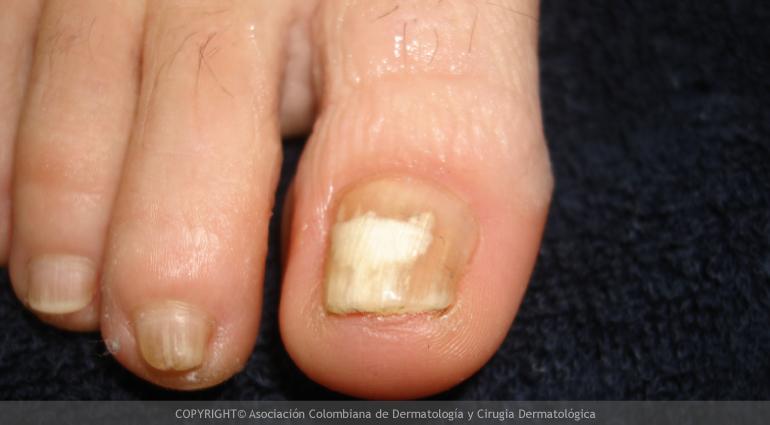 La onicomicosis subungueal distal es la más común, inicia con color blanquecino a pardo amarillento en la parte distal de la uña, más cerca al borde libre, se observa engrosamiento de la uña y despegamiento de la misma.