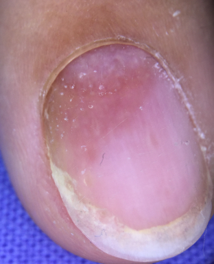 4. Si te aparecen pequeños hoyuelos, con o sin puntos blancos y cambios en el color en una o varias de tus uñas